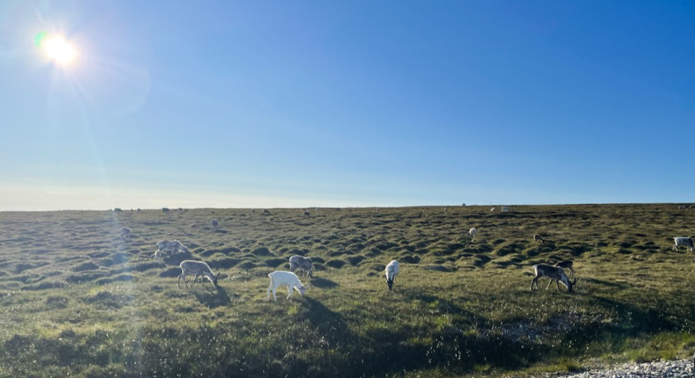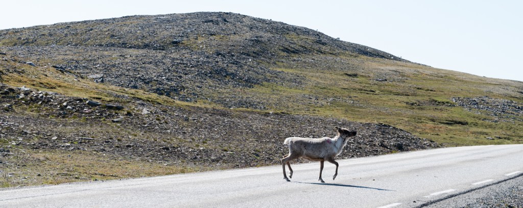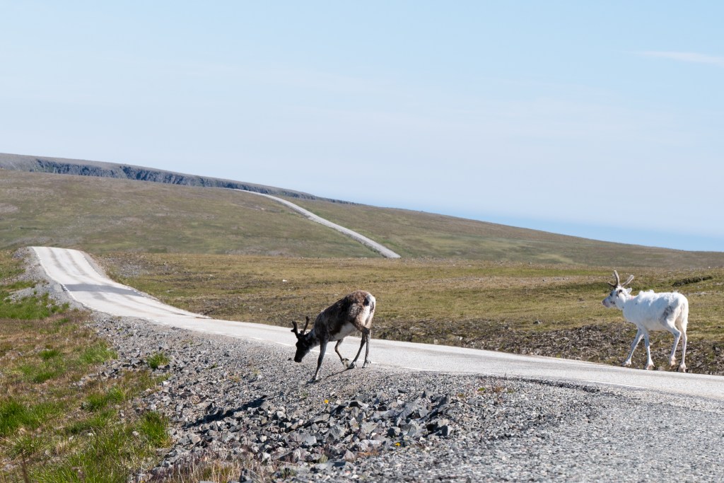 From that point on the volume of reindeer I would see increased as I headed north. By the time I was just short of Nordkapp, there were entire hillsides of them. I had also gotten quite accustomed to their bizarre preference for traveling via the paved road. Time and time again a lineup of vehicles would be bogged down at 2 miles an hour following a reindeer (or many reindeer!) walking down the centerline, choosing the path of least resistance. No one honked. No one got annoyed- not even the delivery trucks that probably dealt with it daily! It seemed like a well-accepted reality of driving in Finnmark. Surprisingly and thankfully, I saw no evidence that any reindeer had perished due to a vehicle encounter. Perhaps the 24 hours of daylight and speed limits generally of 50 mph (80 kph) have something to do with that.