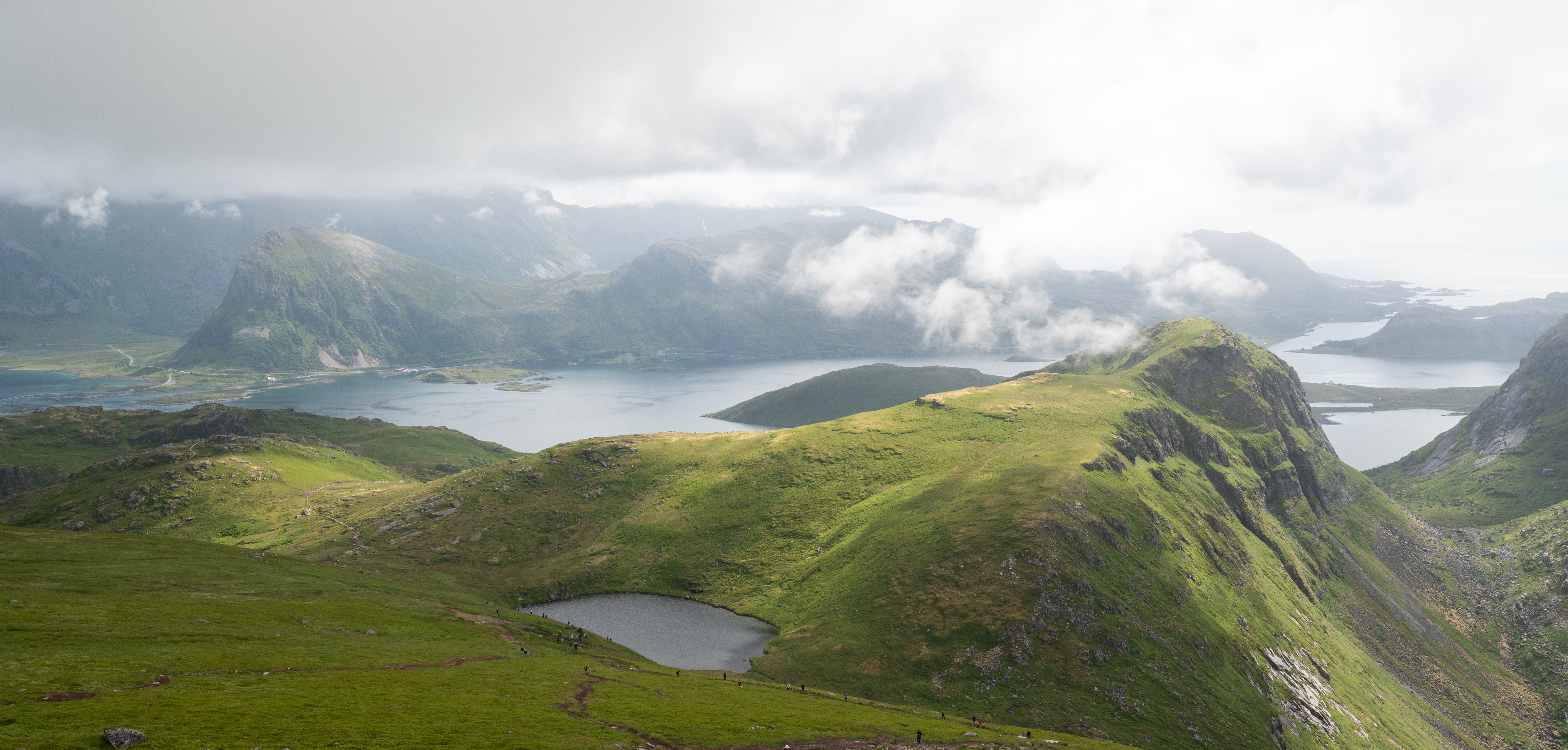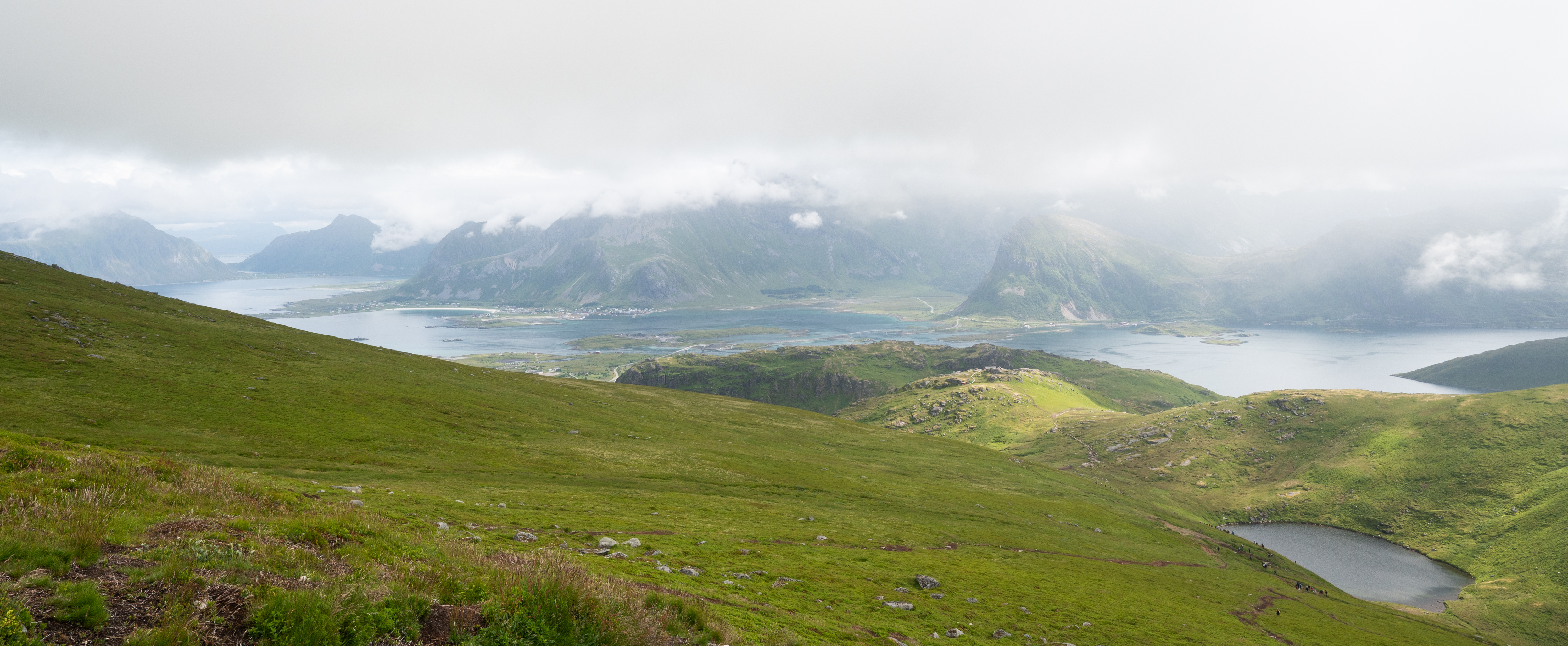 The hike began traversing up the gradual incline of a protected valley. After 20 minutes I arrived at a small lake where a handful of backpackers had spent the night. From there I joined a more main route up to the summit of Ryten, the mountain overlooking Kvalvika Beach. Many other hikers filled the trail but the wide path and expansive geography prevented the area from feeling over-crowded. On the final climb up to Ryten, there were no switchbacks, just a steep pitch with incredible views. I stopped to catch my breath many times and enjoyed the epic scenery.