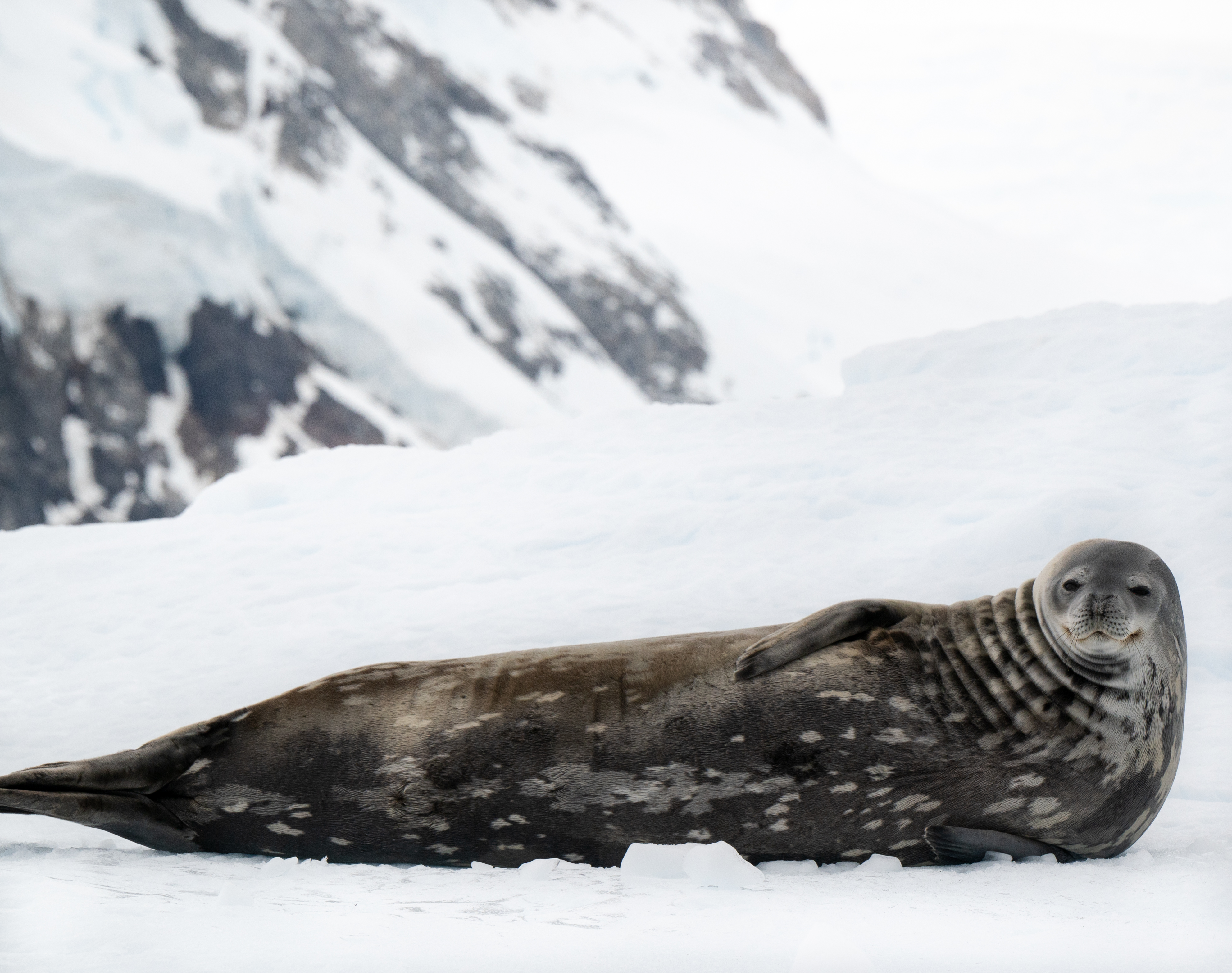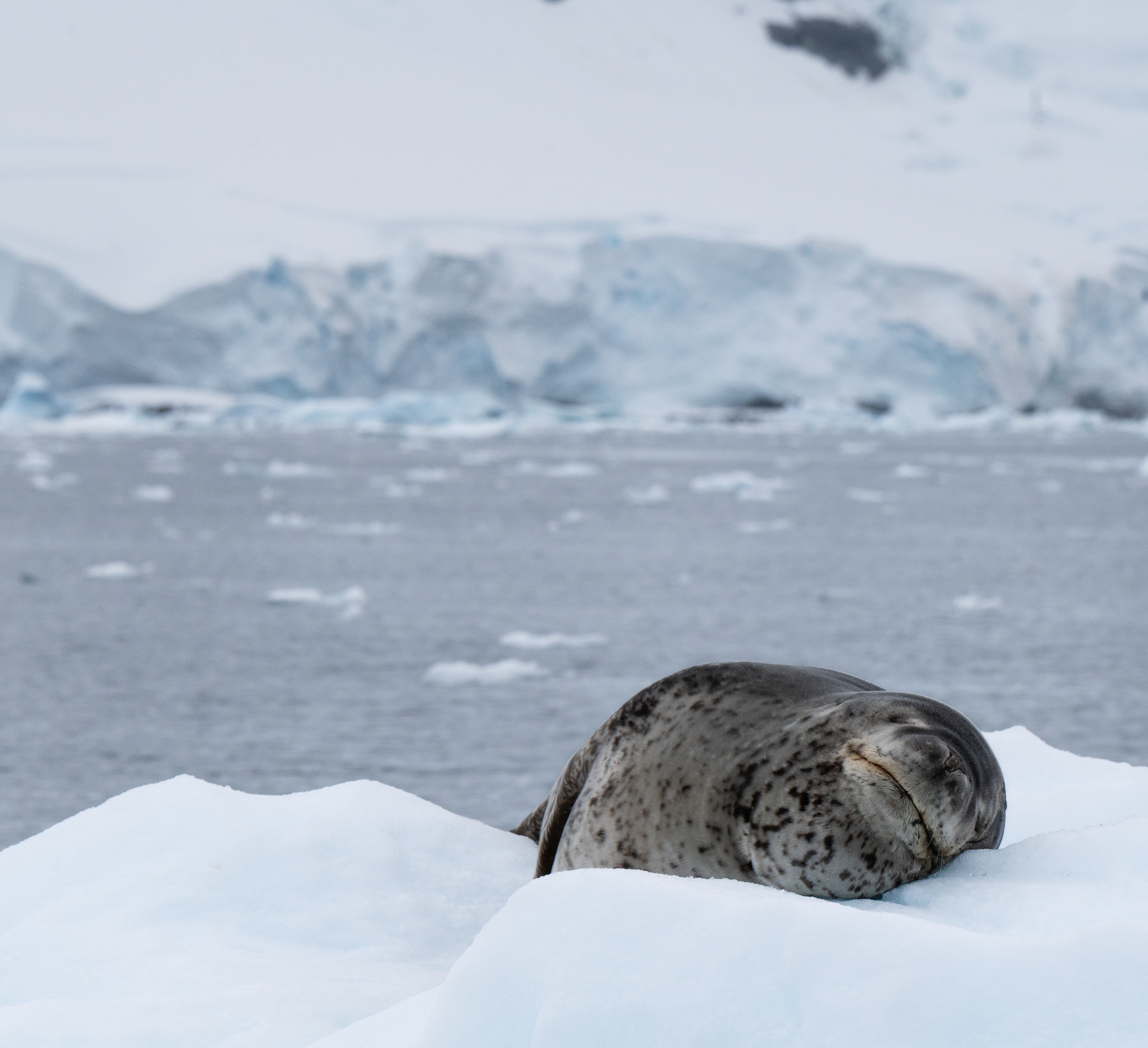 A Leopard Seal. The “killer whale” of the seals. It is a penguin and seal hunter and it has the face of a serpant. But boy do they know how to relax! This seal was also perched up on a floating iceberg.