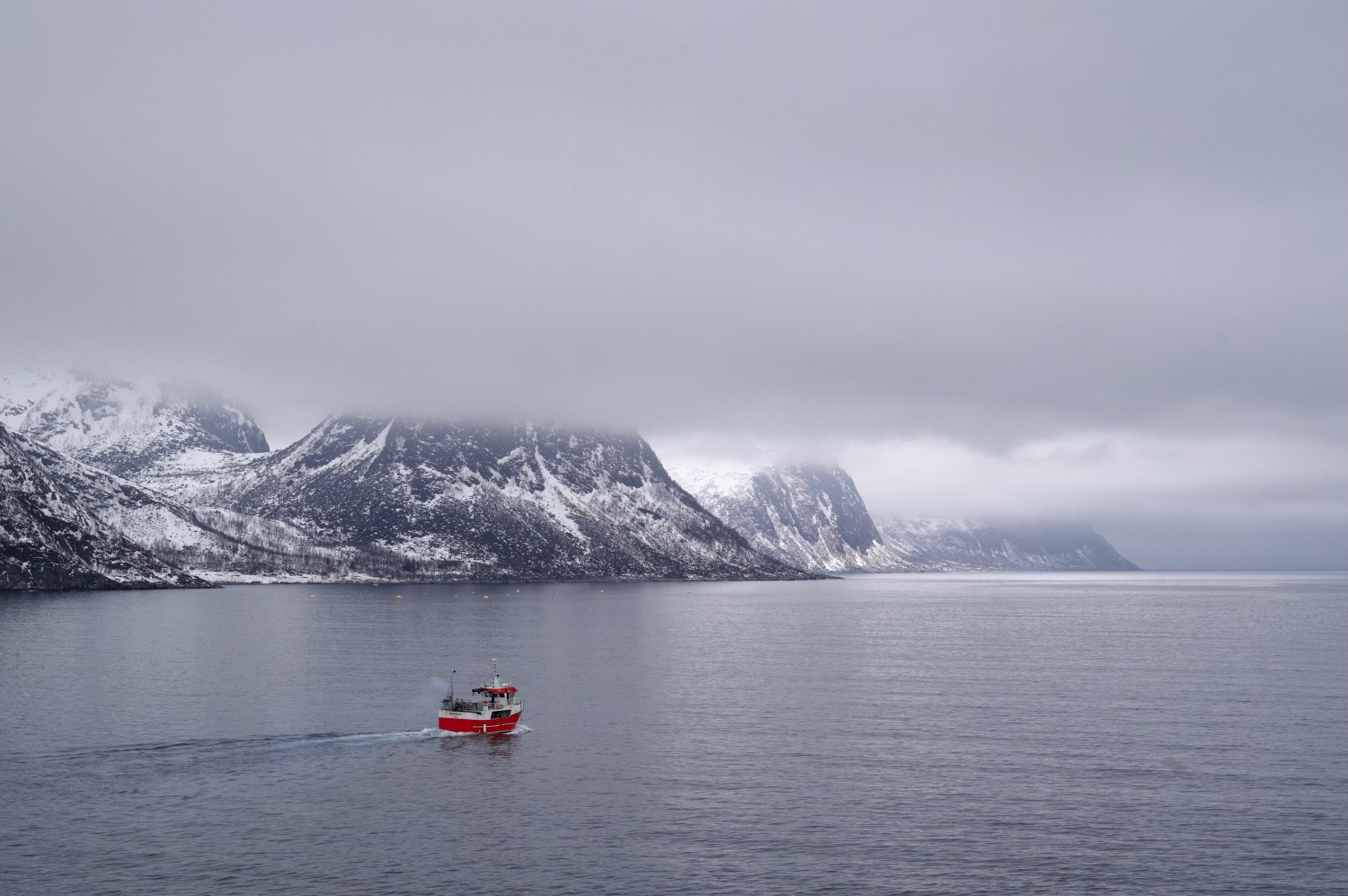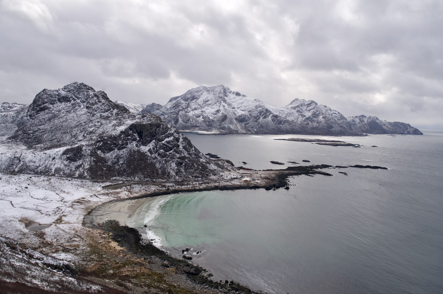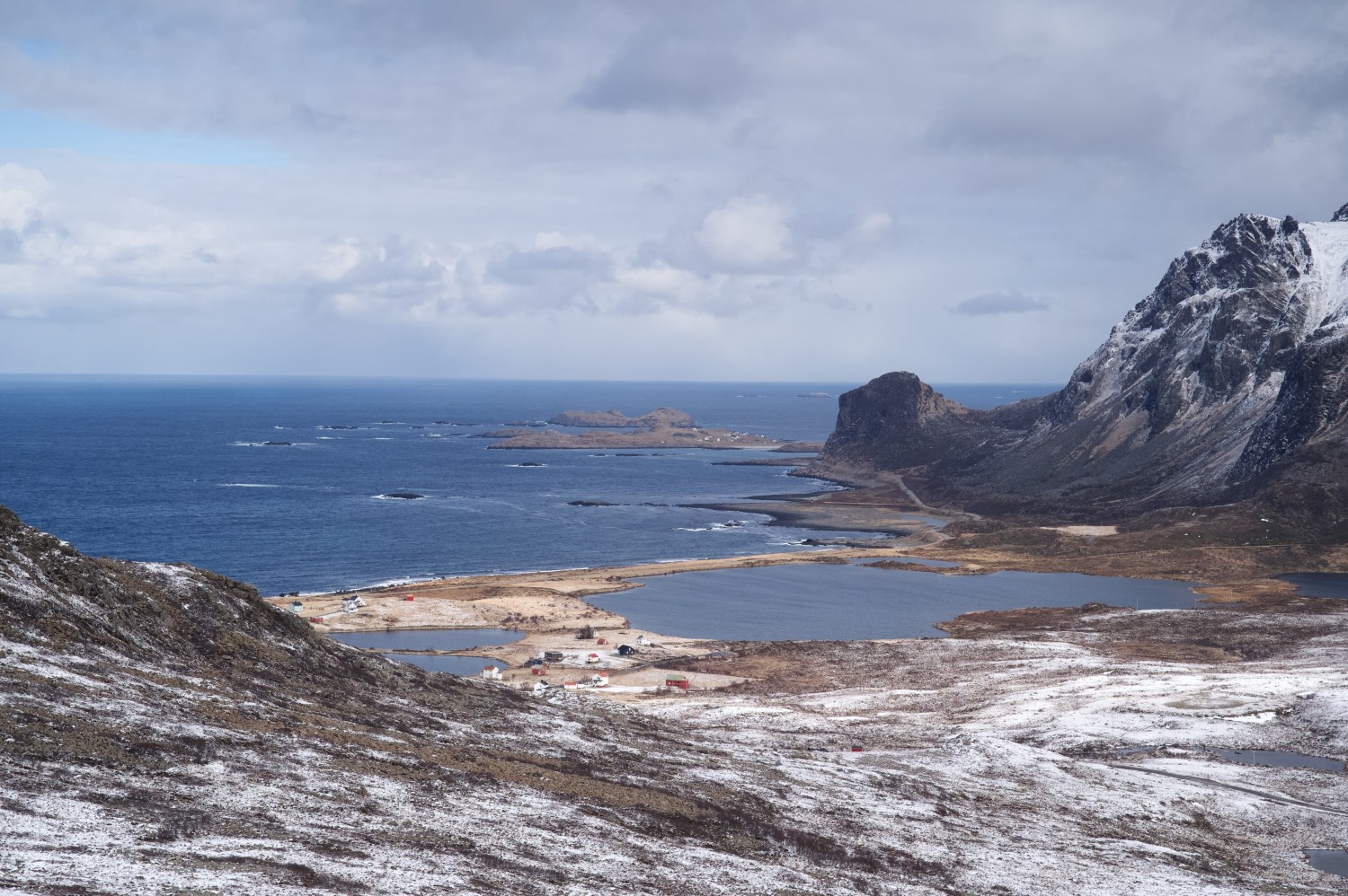 One of the most surprising new discoveries was the town of Nykvåg on the far west side of Norway, just north of the Lofoten Islands, where we camped on the fourth night of our fjord-hopping journey. It felt very off the tourist track and presented us with an area of Norway that looked distinctly different from what we had seen before. With a hard, brown landscape, it felt a bit like Mars, but there was little snow, which meant we could finally put on our hiking shoes!