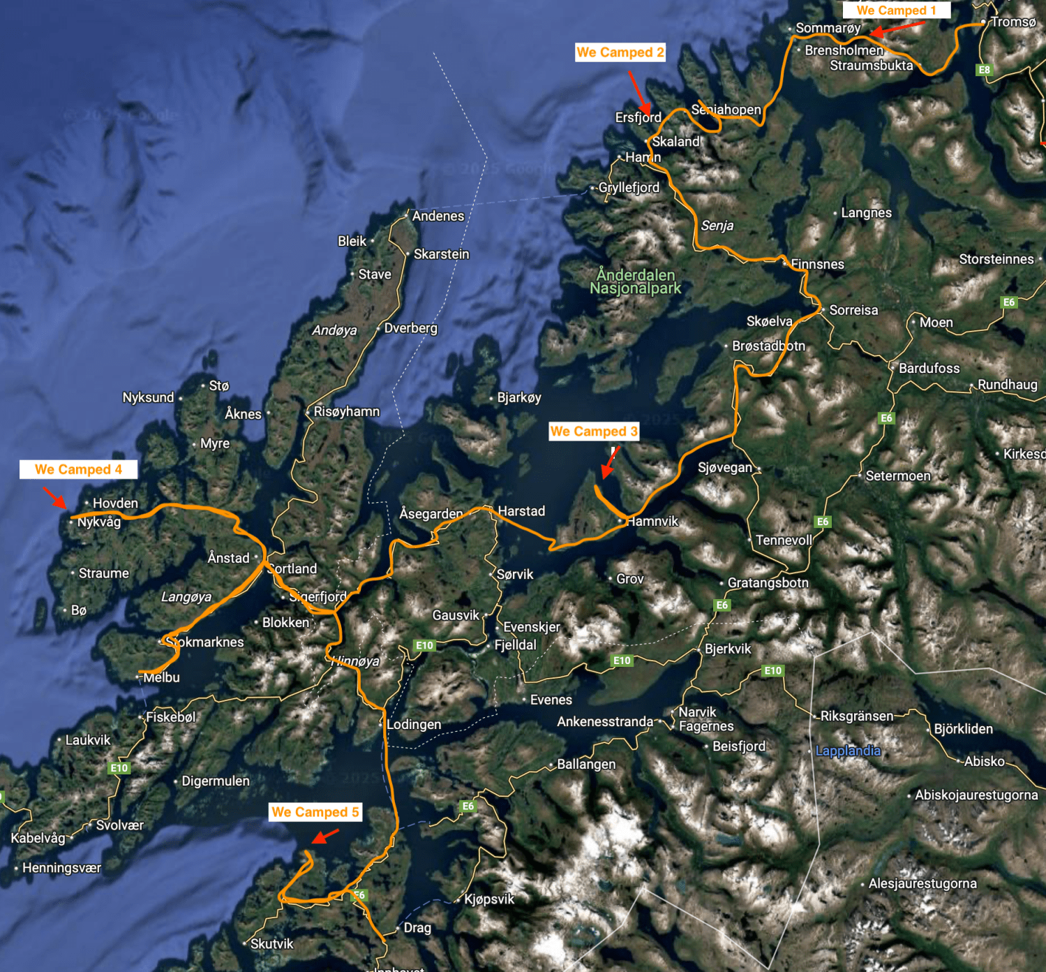 The unusually sunny day that greeted us the next morning was very welcome and thawed our chilled bones after a surprisingly cold night, with freezing temperatures and an incredibly strong wind. It also meant that we could see all the way to the end of the Lofoten Island chain, to where we had begun our journey, two weeks before.