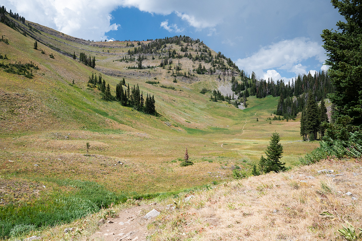 Instead, the next day, I opted to leave the area and spend the night in a campground along the Wyoming/Idaho border. Just a few miles short of the campground, I spotted a trailhead with about five cars parked in the lot. The hike appeared to make its way up a ravine. Still with a hunger for an alpine hike, I wondered if I would find a view of the Tetons and determined that I had found a substitute hike for the day.